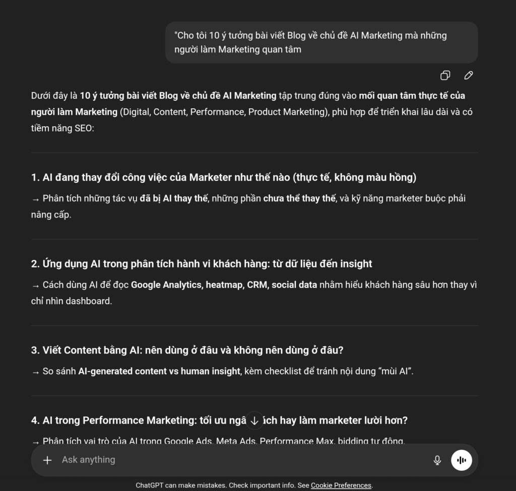 “Cho tôi 10 ý tưởng bài viết Blog về chủ đề AI Marketing mà những người làm Marketing quan tâm nhiều