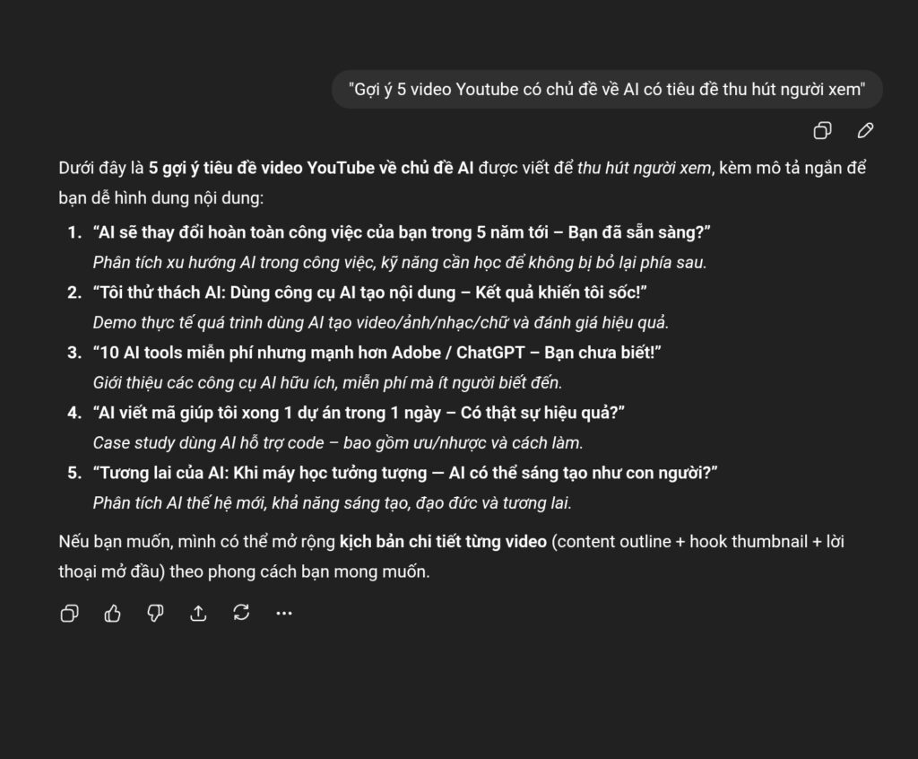 Pro tips: Bạn có thể gỏi ChatGPT “Thời gian dự kiến để thực hiện” hay “Tôi có thể làm gì để có ý tưởng tốt hơn“. ChatGPT sẽ đưa ra cho bạn thời gian dự kiến để làm video, thực hiện dự án…. cũng như đưa ra các nhận xét bổ sung cho ý tưởng của bạn.