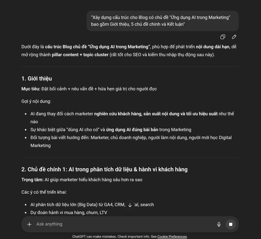 “Xây dựng cấu trúc cho Blog có chủ đề “Ứng dụng AI trong Marketing” ( vừa tạo ở trên ) bao gồm Giới thiệu, 5 chủ đề chính và Kết luận