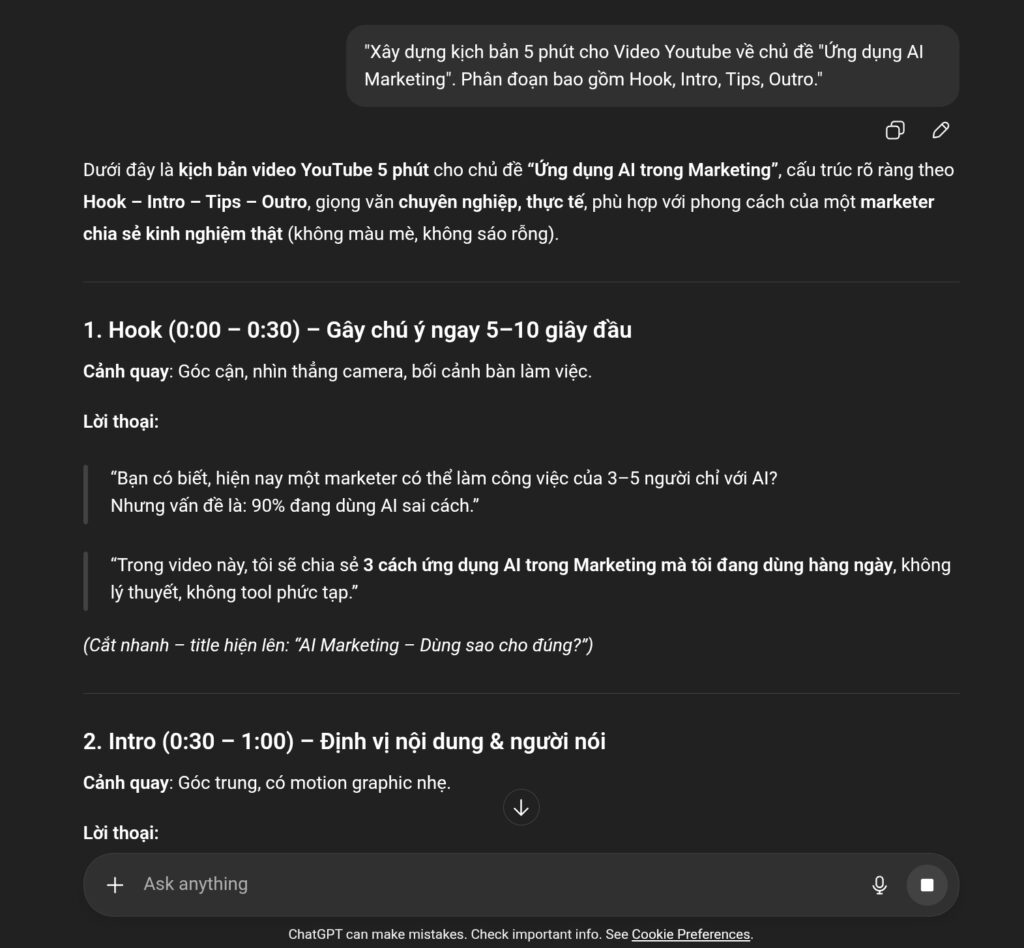 “Xây dựng kịch bản 5 phút cho Video Youtube về chủ đề “Ứng dụng AI Marketing”. Phân đoạn bao gồm Hook, Intro, Tips, Outro.”