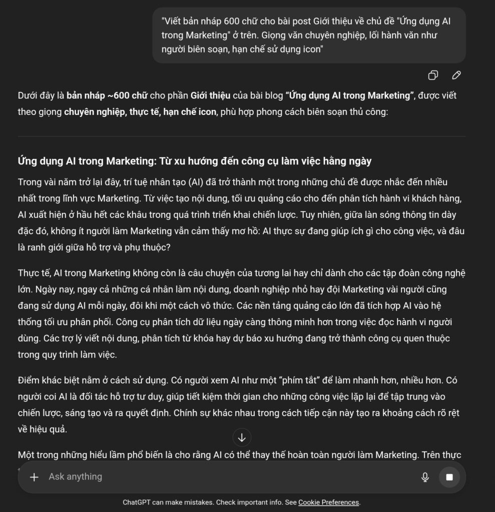 Tuy nhiên, việc làm chủ ChatGPT không chỉ nằm ở kỹ thuật prompt, mà còn ở cách bạn kiểm soát mục tiêu, tập trung vào giá trị cho người đọc và liên tục tinh chỉnh kết quả cho phù hợp với ngữ cảnh. Khi bạn ứng dụng đúng từng bước trong workflow, ChatGPT sẽ thực sự trở thành trợ thủ đắc lực cho việc sáng tạo nội dung trong kỷ nguyên AI.