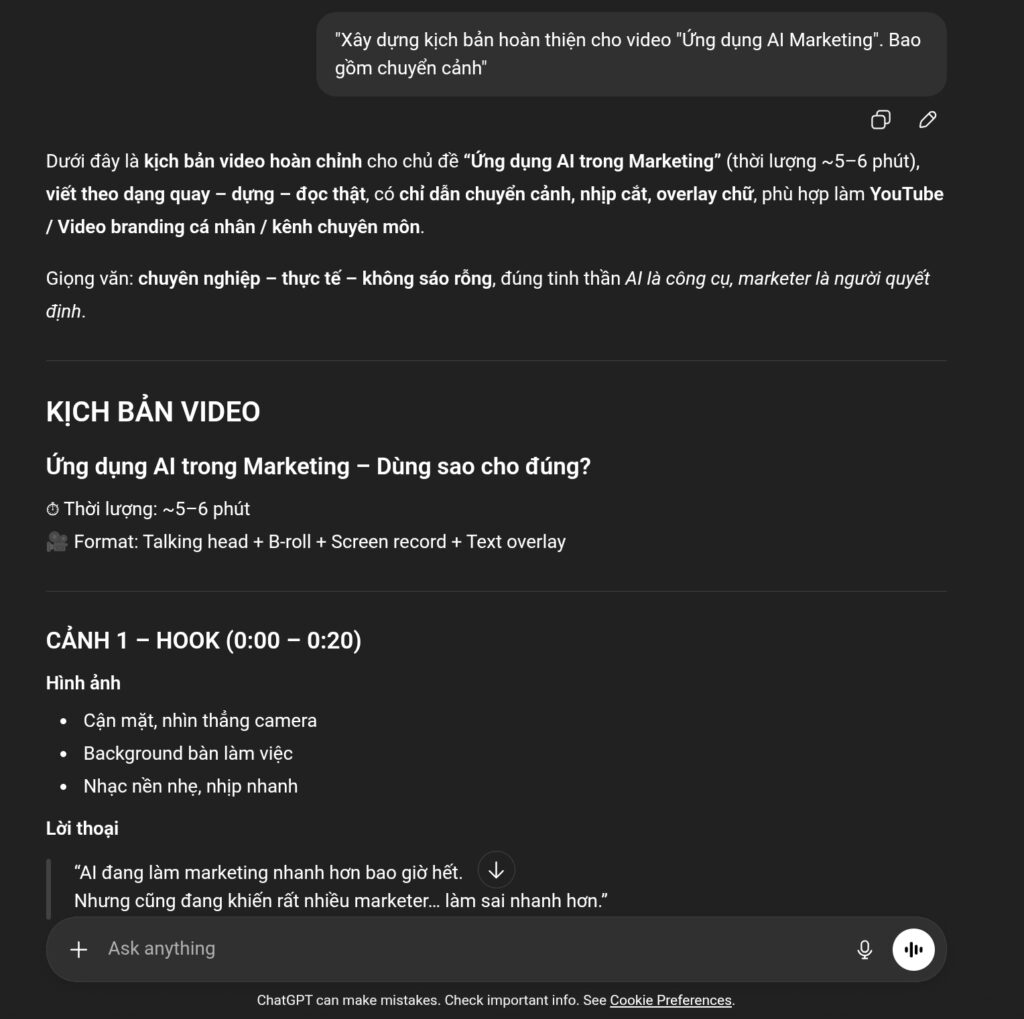 “Xây dựng kịch bản hoàn thiện cho video “Ứng dụng AI Marketing”. Bao gồm chuyển cảnh