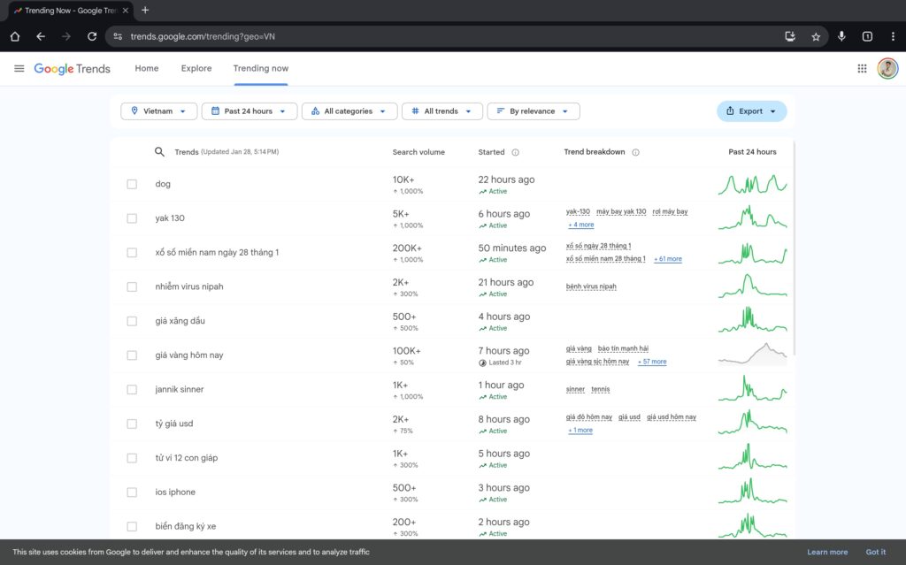 Sau khi truy cập vào Google trends, chuyển sang tab “Trending now”. Tiếp đến chọn khu vực bạn cần theo dõi, khung thời gian muốn theo dõi.