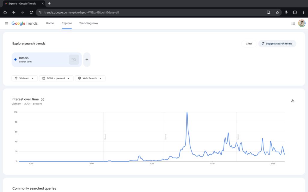Đôi khi bạn cũng có thể sử dụng công cụ Google Trends để xác định sự quan tâm của xã hội đến một số loại tài sản lớn nhất định, ví dụ như bitcoin. Đôi lúc biết được thị trường vẫn còn quan tâm nhiều đến một loại tài sản nào đó sẽ giúp chúng ta cảm thấy yên tâm hơn khi sở hữu.