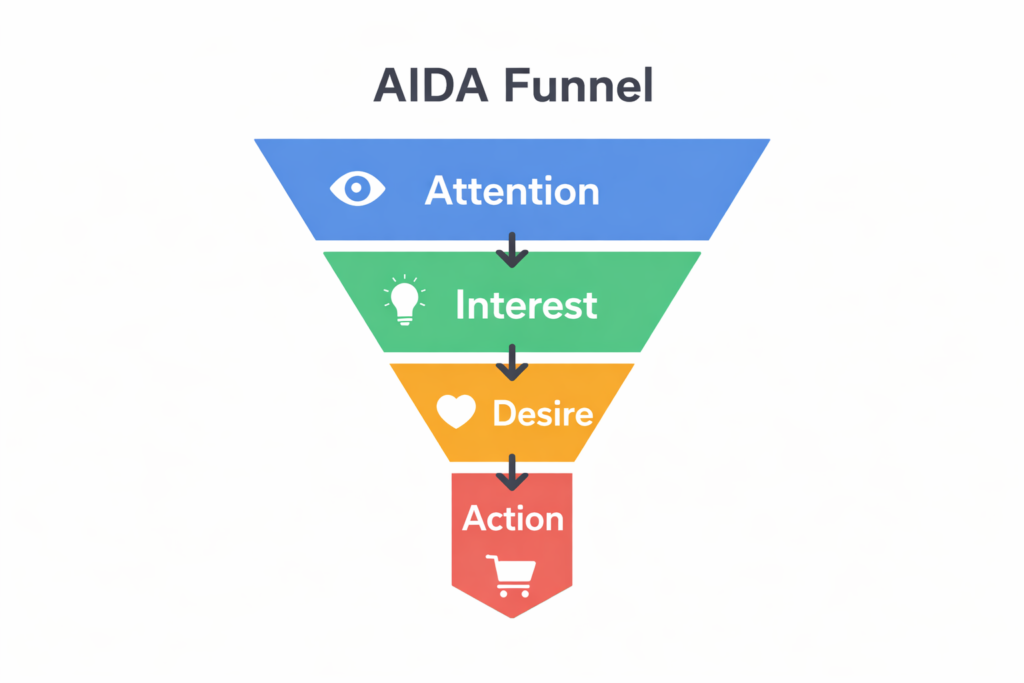 Phễu AIDA bao gồm 4 giai đoạn hành trình khách hàng: