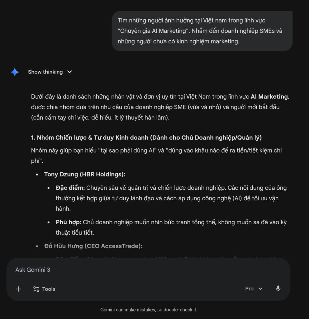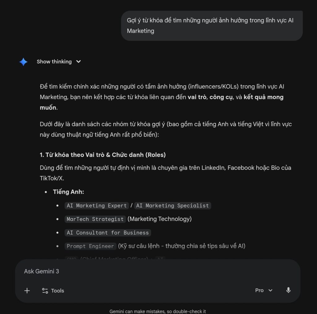 Ví dụ nhập câu lệnh: “Tìm những người ảnh hưởng tại Việt Nam trong lĩnh vực ‘Chuyên gia AI Marketing’. Nhắm đến đối tượng doanh nghiệp SMEs và những người chưa có kinh nghiệm marketing.”