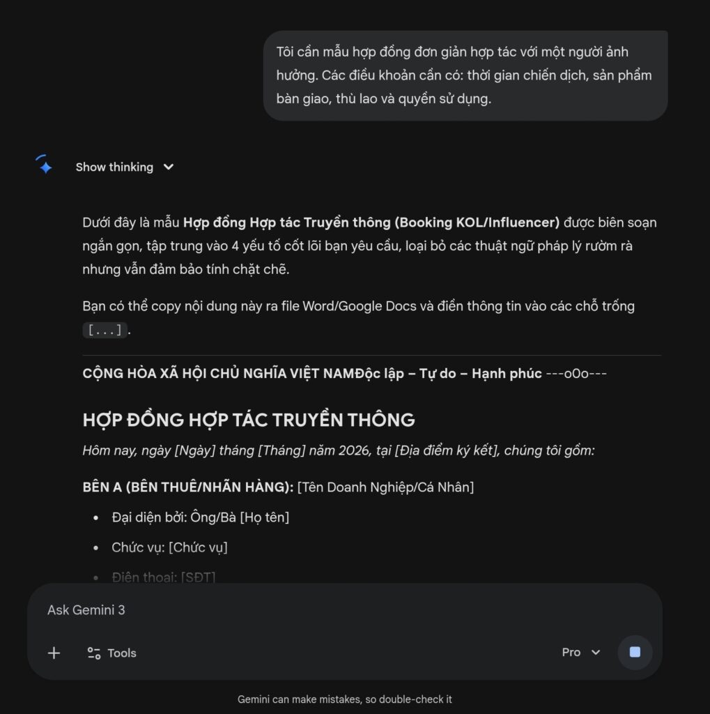 Nếu bạn chưa bao giờ hợp tác với người ảnh hưởng và chưa có kinh nghiệm làm hợp đồng, AI sẽ là cứu cánh tuyệt vời để soạn thảo khung hợp đồng.